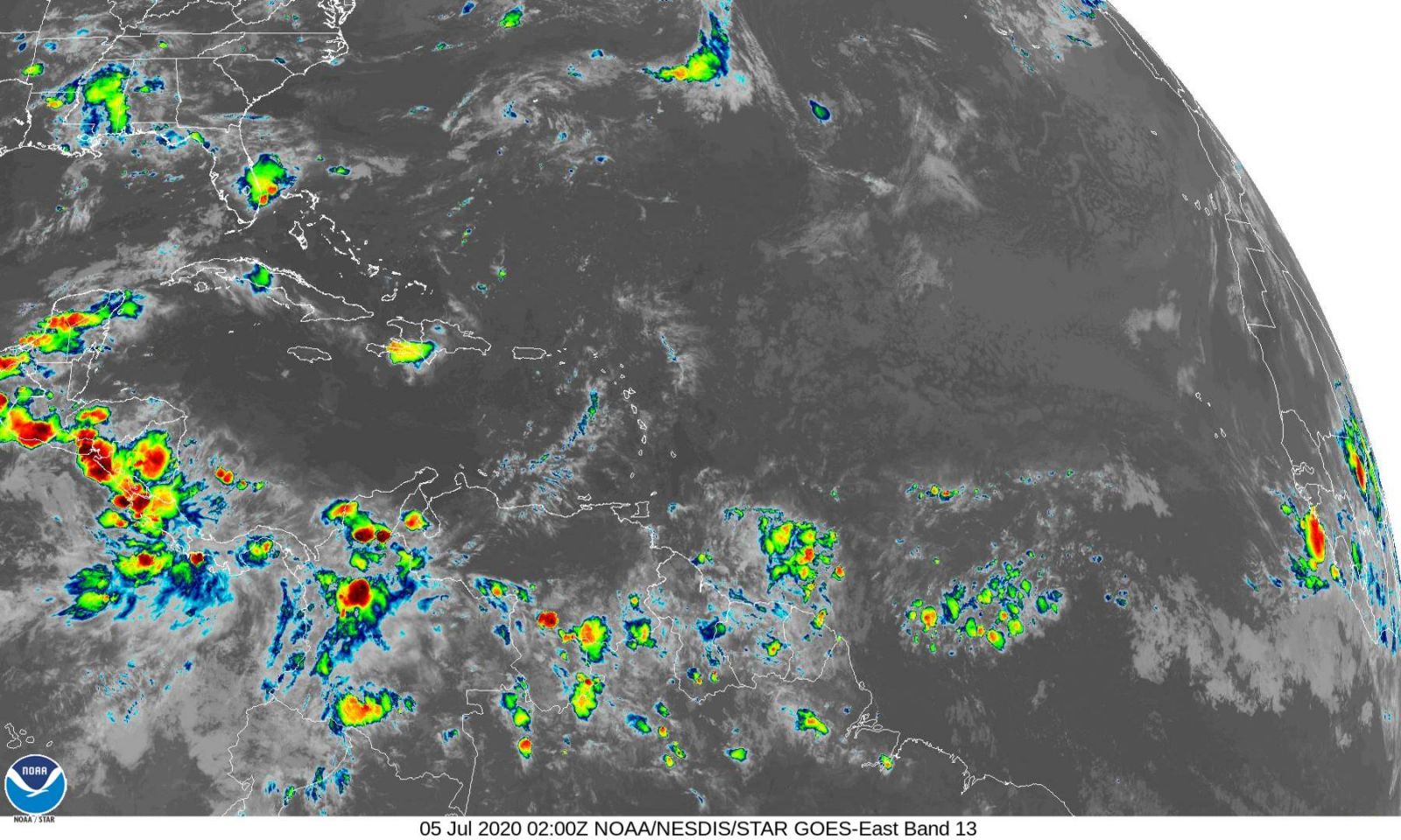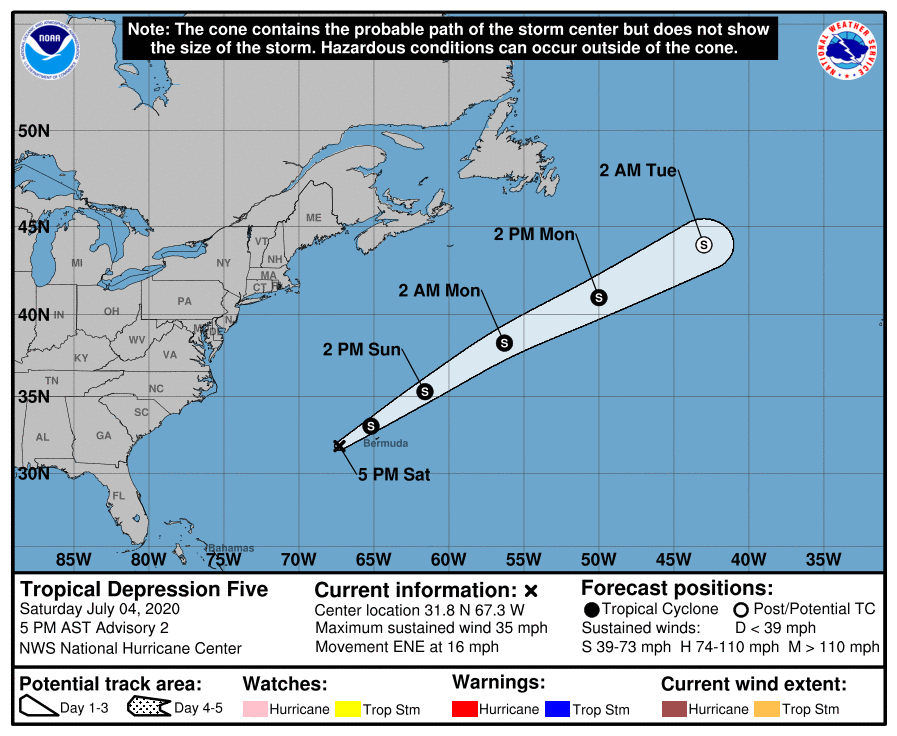 FUENTE: www.nhc.noaa.gov SINOPSIS La Depresión Tropical No. 5 se ubicaba en el Atlántico, se encontraba en esta tarde en la Longitud 31,8° Norte y Longitud 67,3° Oeste a 2400 km al oeste y suroeste de las islas de Bermuda, tiene vientos sostenidos de 55 km/h con rachas mayores, se mueve rápido hacia el este y noreste a 26 m/h y tiene una presión barométrica de 1.007 hPa. De acuerdo a los modelos de pronóstico matemáticos de posible trayectoria se espera mantenga su movimiento hacia el este y noreste y alcance esta noche o mañana domingo temprano la parte noroeste y norte de las islas de Bermuda; también se espera aumente su movimiento de traslación y gane un poco de fuera y se convierta en la Tormenta Tropical “EDOUARD”. Debido a su lejanía y dirección de desplazamiento no es de peligro por el momento para la península de Yucatán. Elaboró: Juan Vázquez Montalvo Meteorólogo del Comité Institucional para la Atención de los Fenómenos Meteorológicos Extremos de la UADY